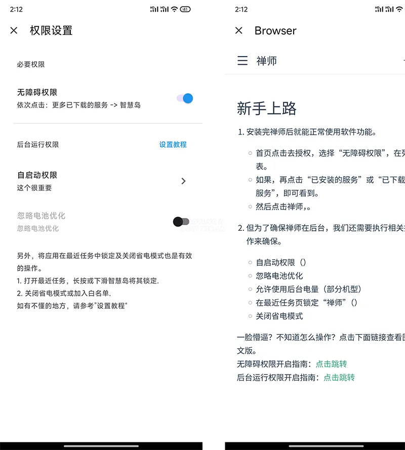 需要先设置无障碍权限后才能使用,在权限设置找到无障碍权限,更多已下载的服务,选择「智慧岛」。另外避免被系统杀后台,你还要开启自启动权限,不会设置的可以看新手上路教程。
