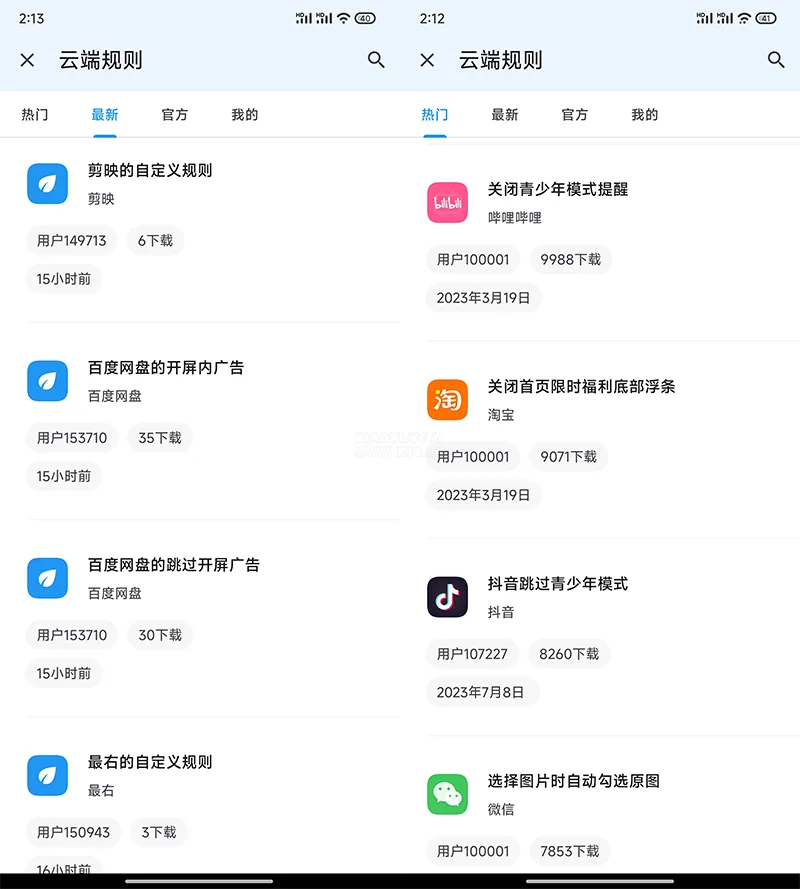 应用内置云规则,有用户分享的规则,也有官方提供的规则,当然你也可以自己建立规则然后分享给大家。这里的规则不仅是跳过启屏推广,还有各种自动跳过的规则,例如:跳过青少年模式的提示、跳过淘宝限时福利底部悬浮条等。