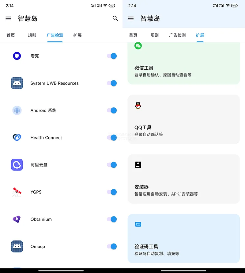 其它功能方面,内置了广告检测功能,会自动检测你手机已安装应用,默认是全选的,你也可以给单独 APP 关闭检测。以及扩展功能提供了 QQ 登录自动确认、APK.1 安装器、验证码自动复制工具。