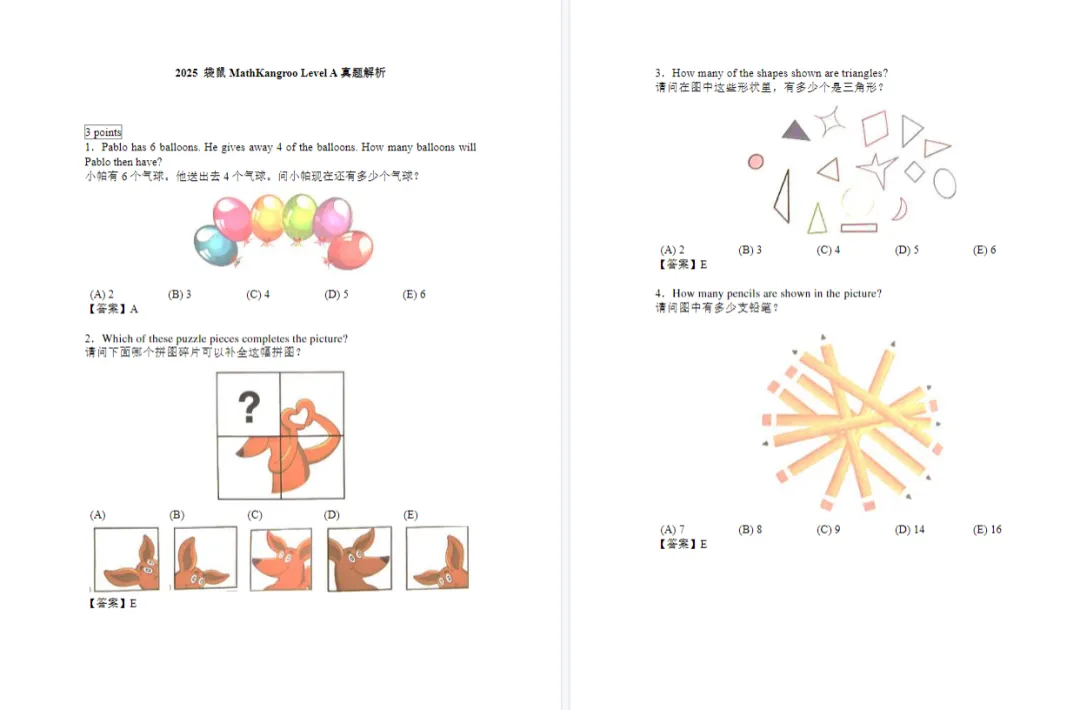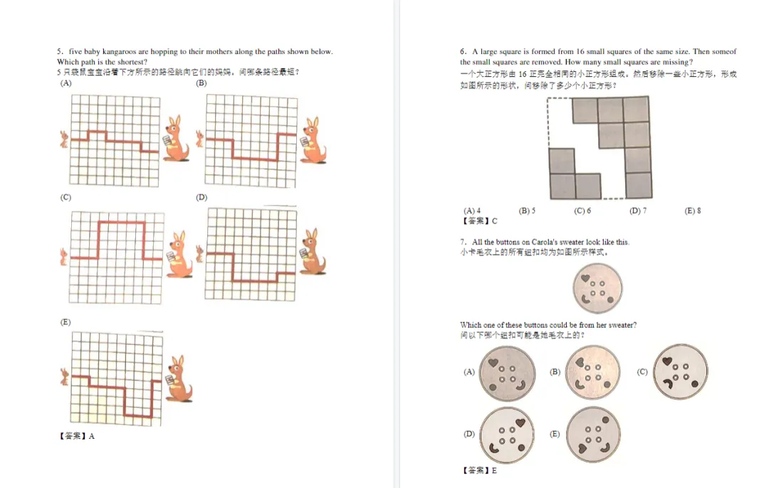 袋鼠数学竞赛考试在即,对于正在备考袋鼠数学竞赛的同学,我们整理了袋鼠数学竞赛历年真题,帮助大家更好的学习和备考!此外犀牛教育针对袋鼠数学竞赛也开设了相关课程,详情咨询文末小助手!