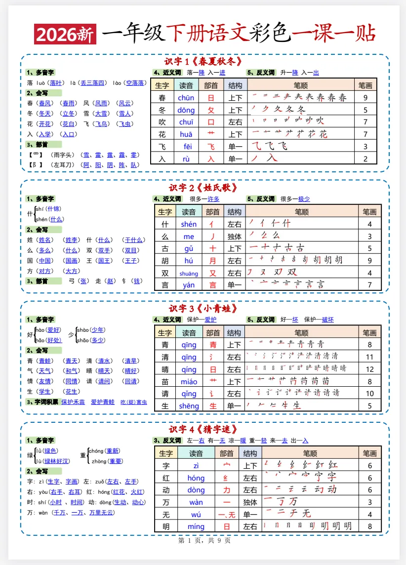 26春一年级下册语文彩色一课一贴(电子版可下载打印)