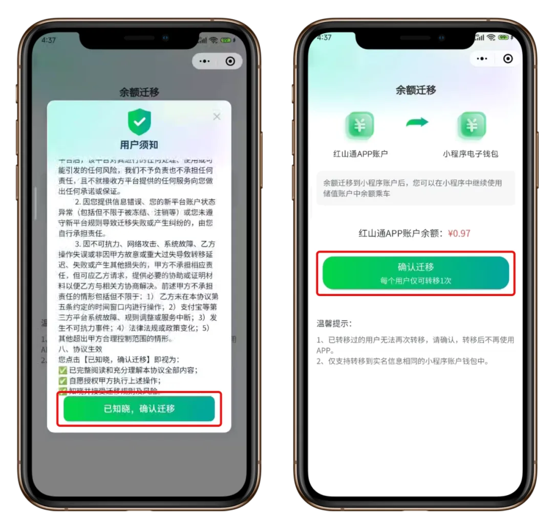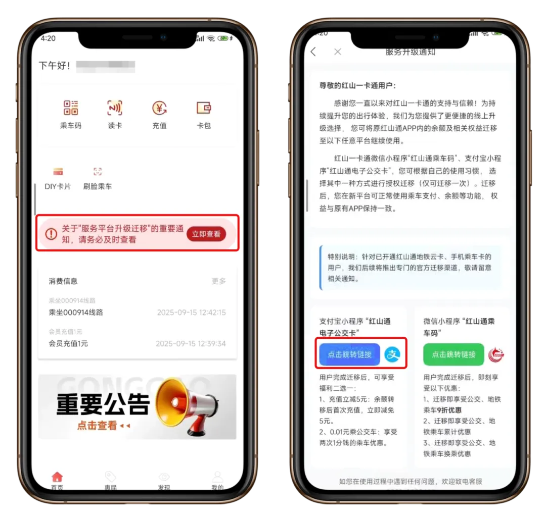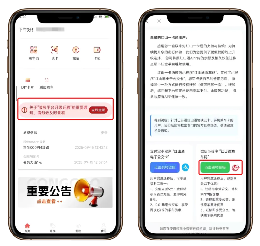 为了保证大家在3月1日后能继续顺畅出行,请务必在截止日期前,根据红山通APP内的迁移公告,将您的账户信息及余额迁移至“微信|红山通乘车码小程序”或“支付宝|红山通电子公交卡小程序”。