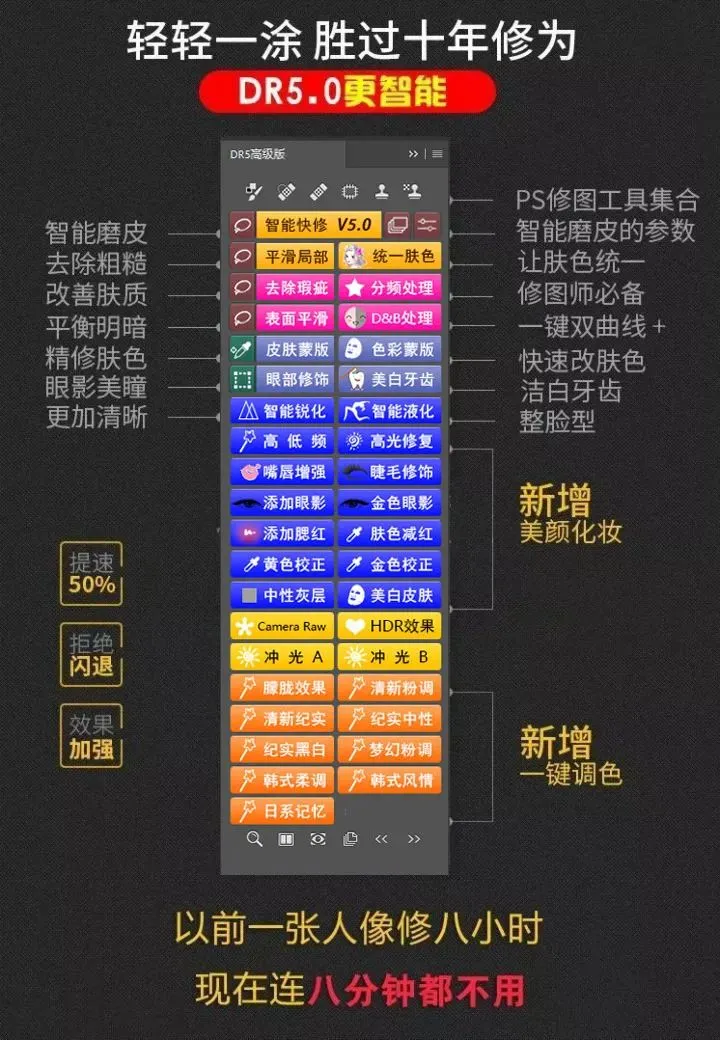 DR5.0的功能非常强大,作为Photoshop 摄影后期修图专业插件,拥有修图、磨皮、美白、塑型等30多个功能的插件,修图只需一键即可,轻松帮你搞定各种问题,快速简单为你带来更好的效果。