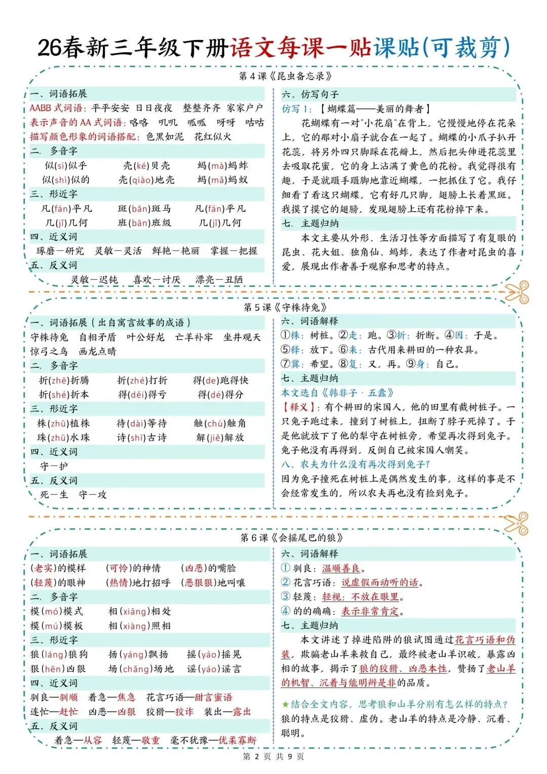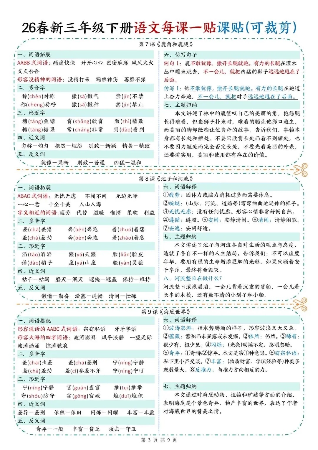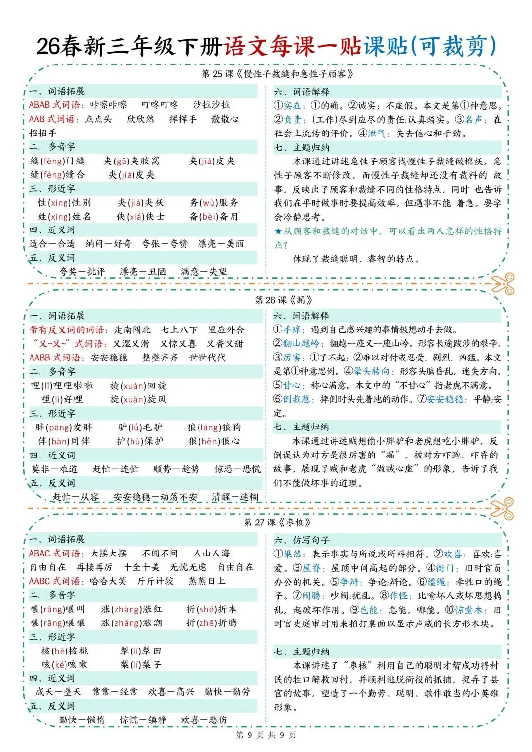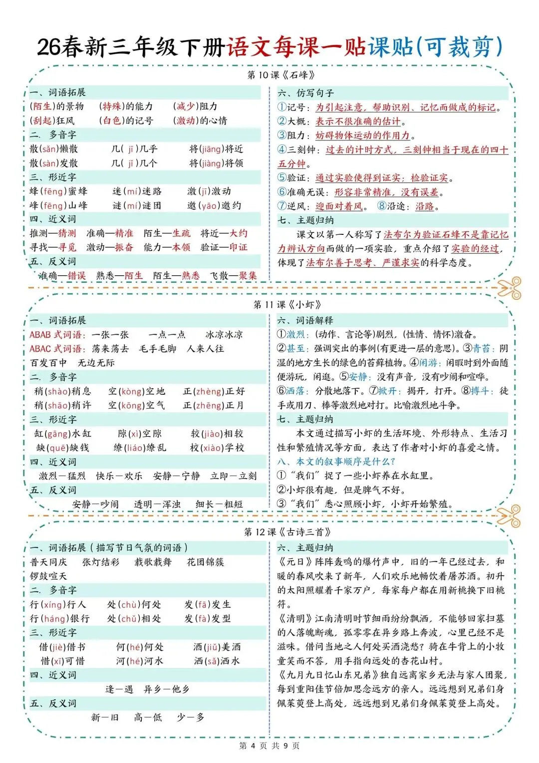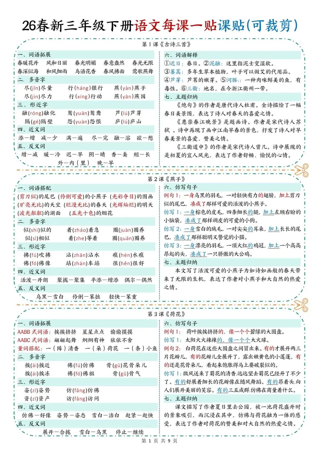 学校老师刚发的,26新版三年级下册语文《每课知识点课课贴》,共9页可打印,这份三年级下册语文知识点课课贴,涵盖了每课词语搭配、多音字、形近字、近反义词、仿写句子等,家长看文末领取方式,给孩子打印出来,用不干胶贴在对应课文,帮助孩子课前课后预习巩固!