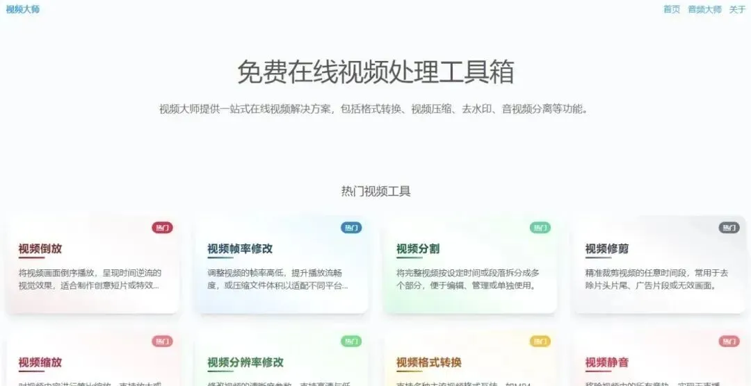 视频大师是一个全能且免费的在线视频处理工具箱;软件支持浏览器访问。