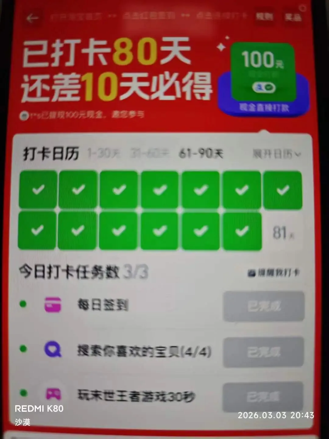 入口(受邀用户才有):淘宝首页-红包签到-连续打卡