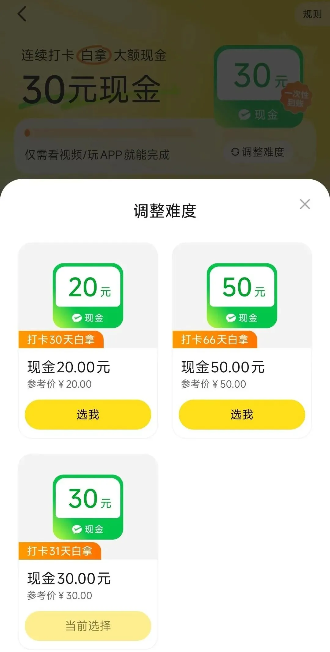 有20/30/50现金可选,打卡时间不同,任务难度不同