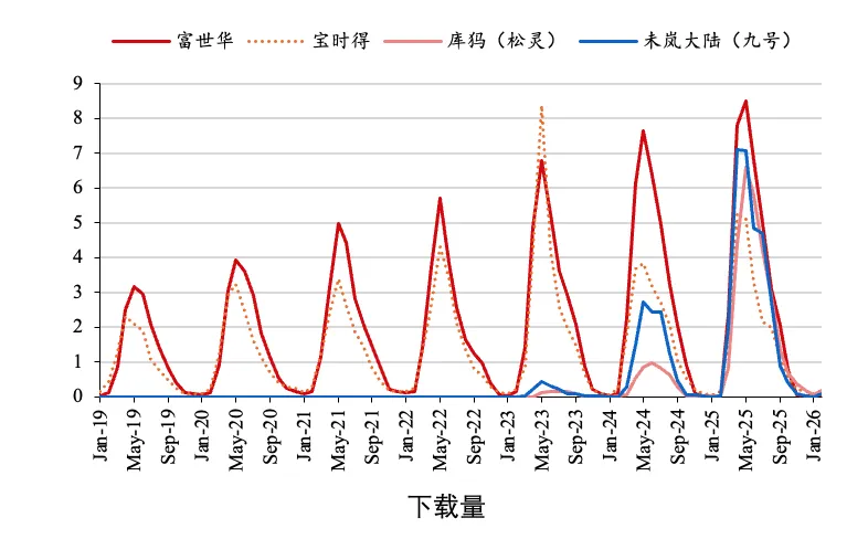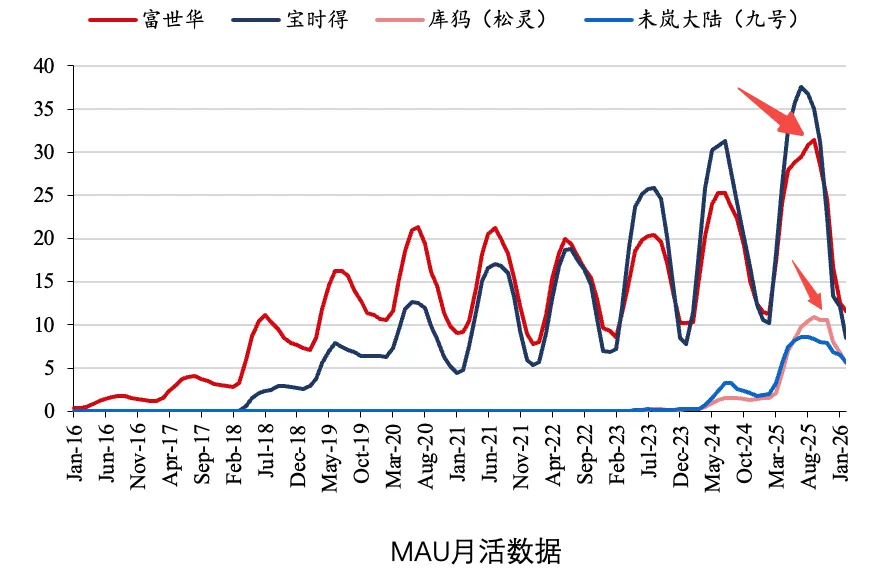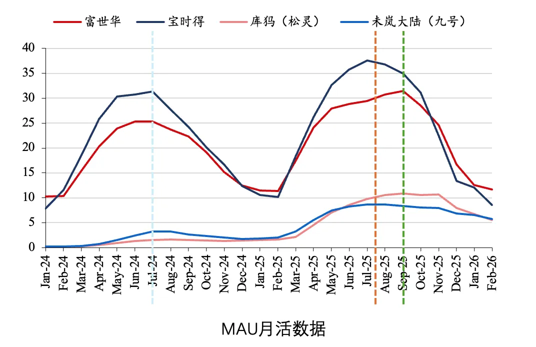 而2026年的MAU曲线形态则发生了变化,富世华和未岚大陆(九号)的形态没有发生太大改变,高峰依然在7月出现(橙色),随后下降。