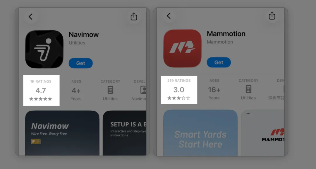 不过我检查过下载数据后发现,美区的Mammotion的APP下载量数据有问题,非常低。我又用我的美区账号去iOS的AppStore看了Rating数量,对比Navimow的1K的数据(评分4.7星),库犸的评论数只有219条(3.0星惨不忍睹),明显不正常。