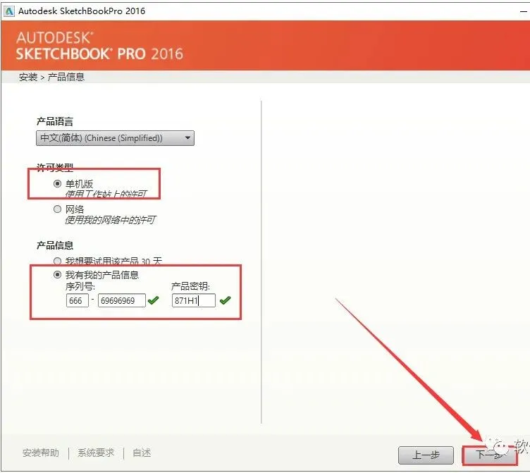 7.选择许可类型【单机版】,输入序列号【666-69696969】与产品密钥【871H1】,然后点击【下一步】。