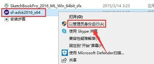 17.打开开始安装包解压后的【SketchBook2016】文件夹,鼠标右击【xf-adsk2016_x64】选择【以管理员身份运行】。