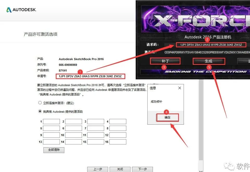 18.①使用快捷键“Ctrl+C”复制【申请号】;②使用快捷键“Ctrl+V”将代码粘贴到【Request】后的框中(记得删除原框中内容);③点击【Patch】;④点击【确定】;⑤点击【Generate】生成激活码。