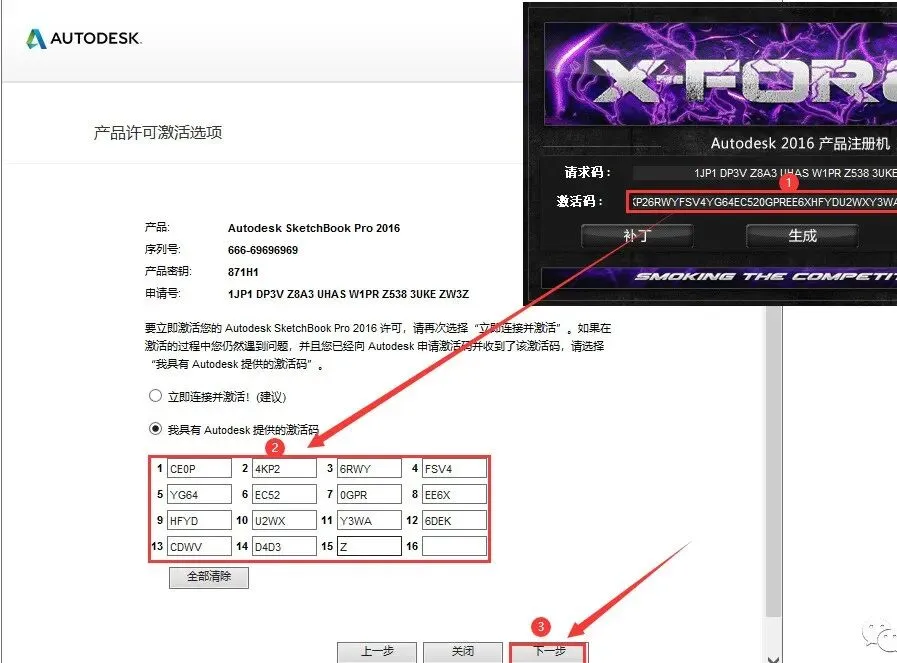 19.①使用快捷键“Ctrl+C”复制【Activation】后框中的激活码;②使用快捷键“Ctrl+V”将激活码粘贴到【激活码输入框】中;③点击【下一步】。