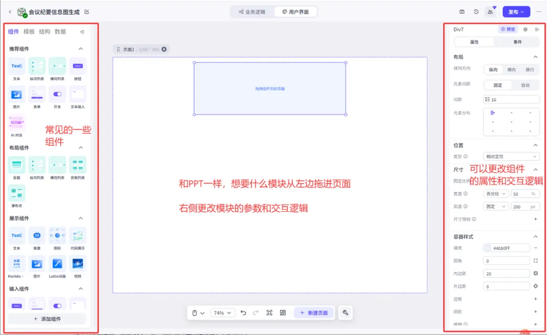 扣子平台的页面搭建非常直观,就像做 PPT 一样,把需要的组件拖到画布上即可。