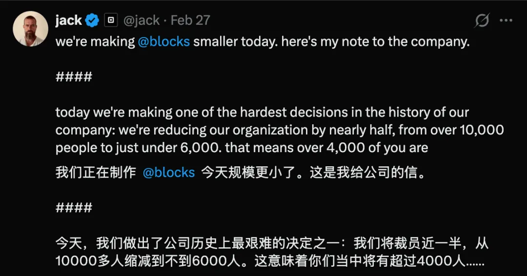 而这次第一个动刀子的是推特(现名𝕏)的创始人杰克·多西,他在社媒上广而告之Block的裁员通知: