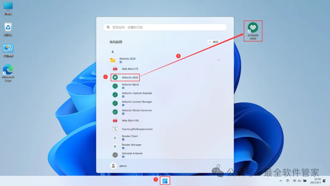 12、回到桌面,点击任务栏的【开始菜单】,在【所有应用】中找到【Artlantis 2020软件图标】,将软件图标拖到桌面上,完成软件桌面快捷方式的创建