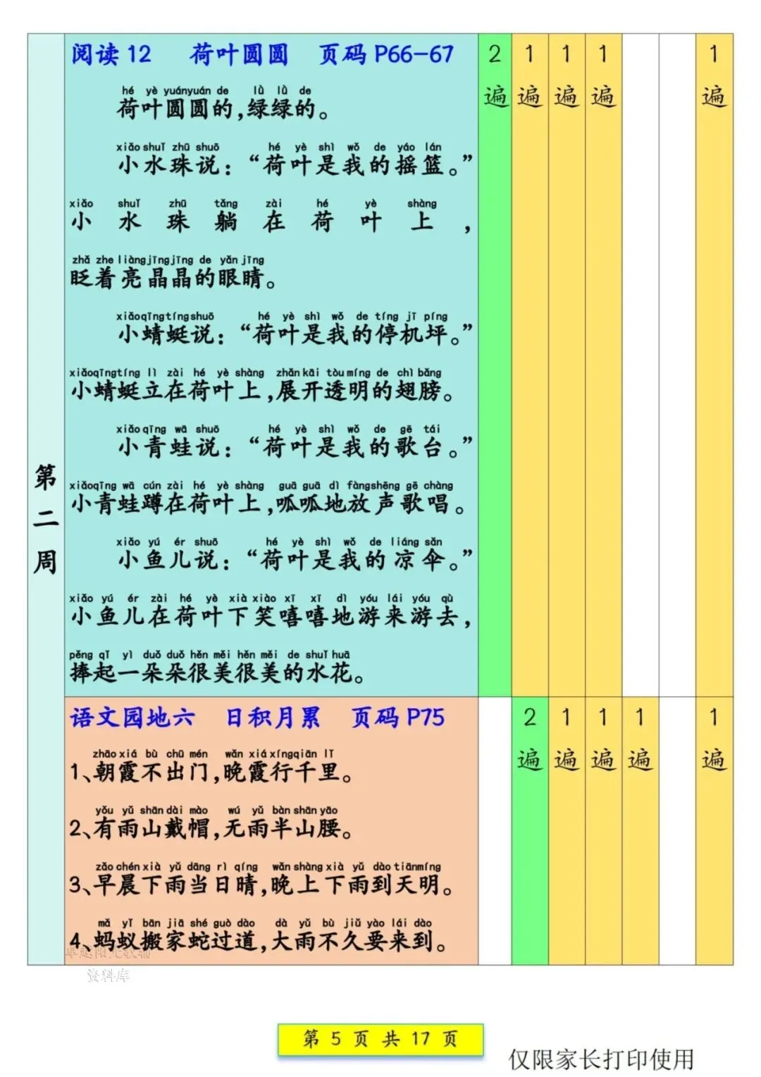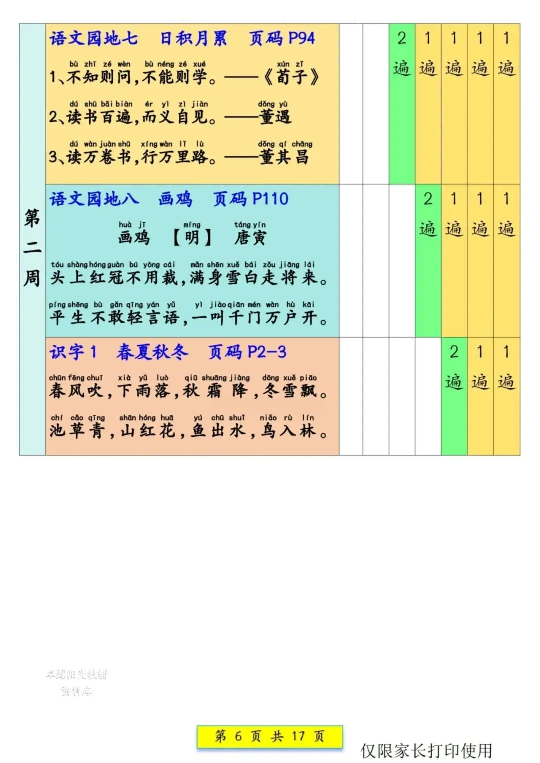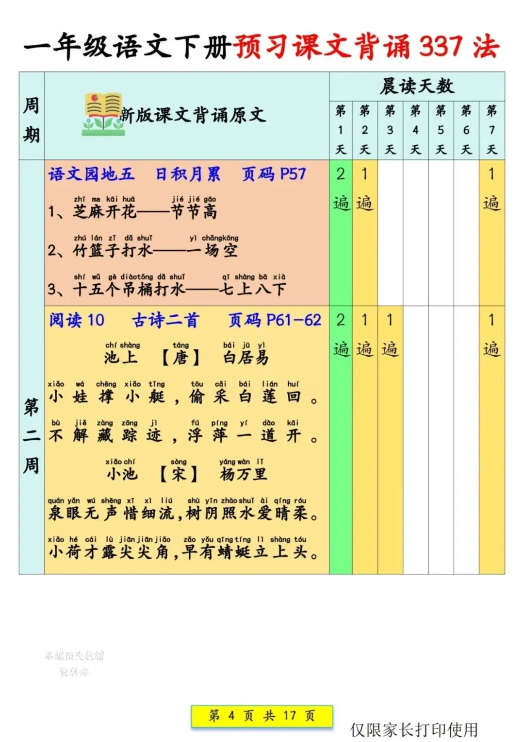 一年级语文下册预习课文背诵337法(可打印),晨读计划助力孩子轻松背诵
