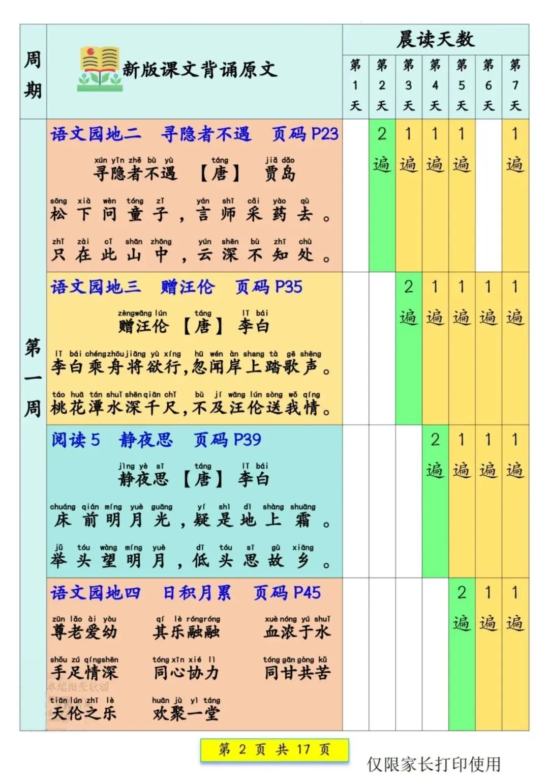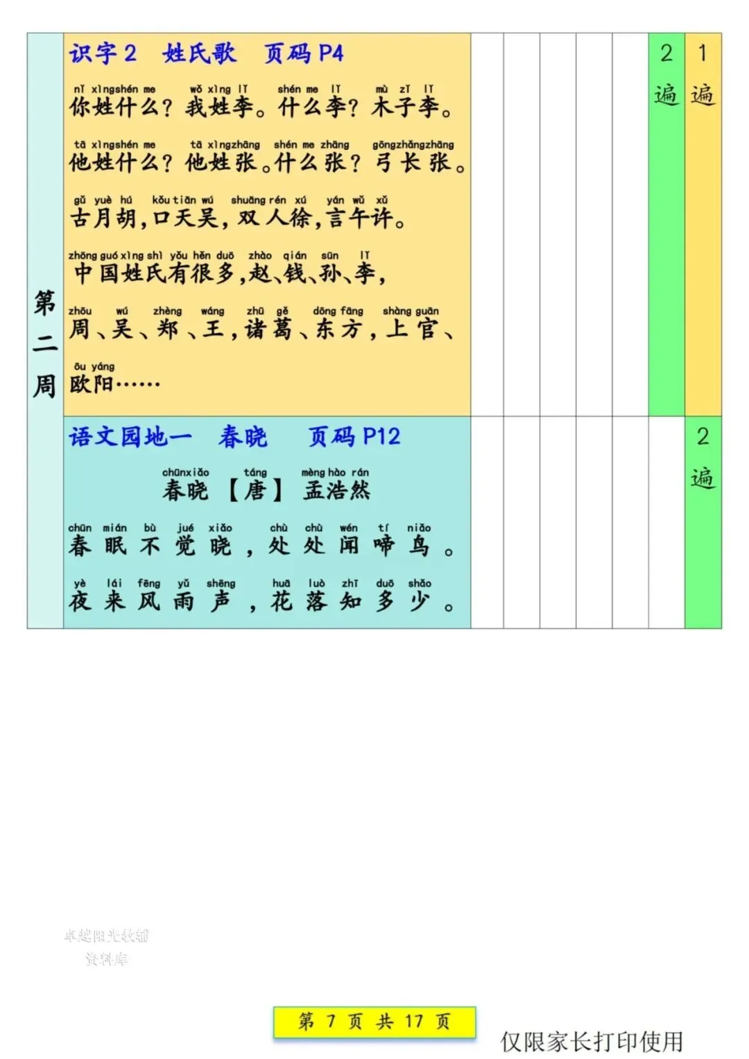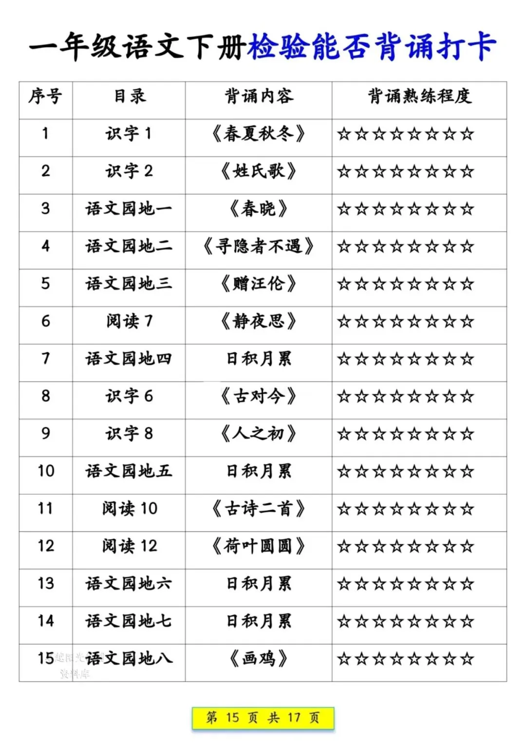 一年级语文下册预习课文背诵337法(可打印),晨读计划助力孩子轻松背诵