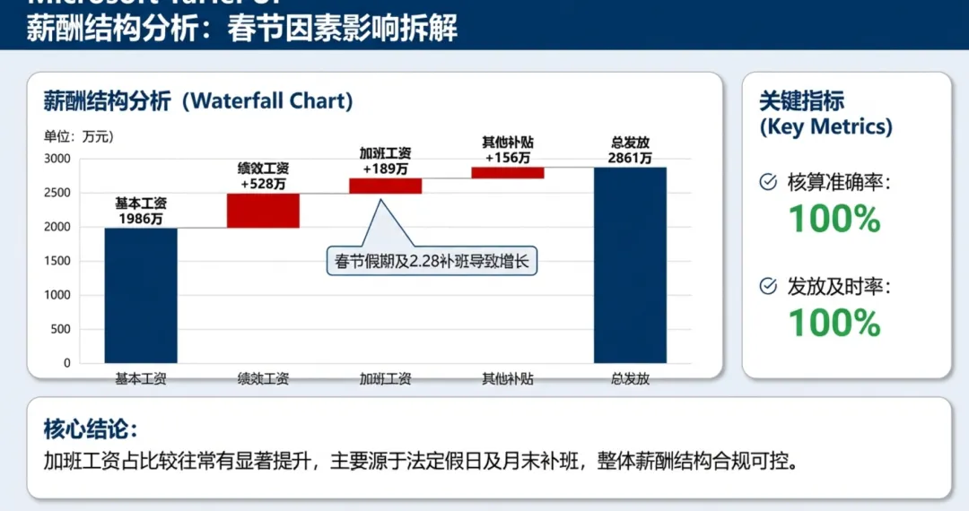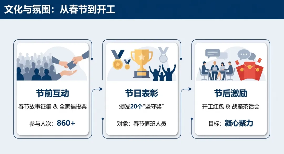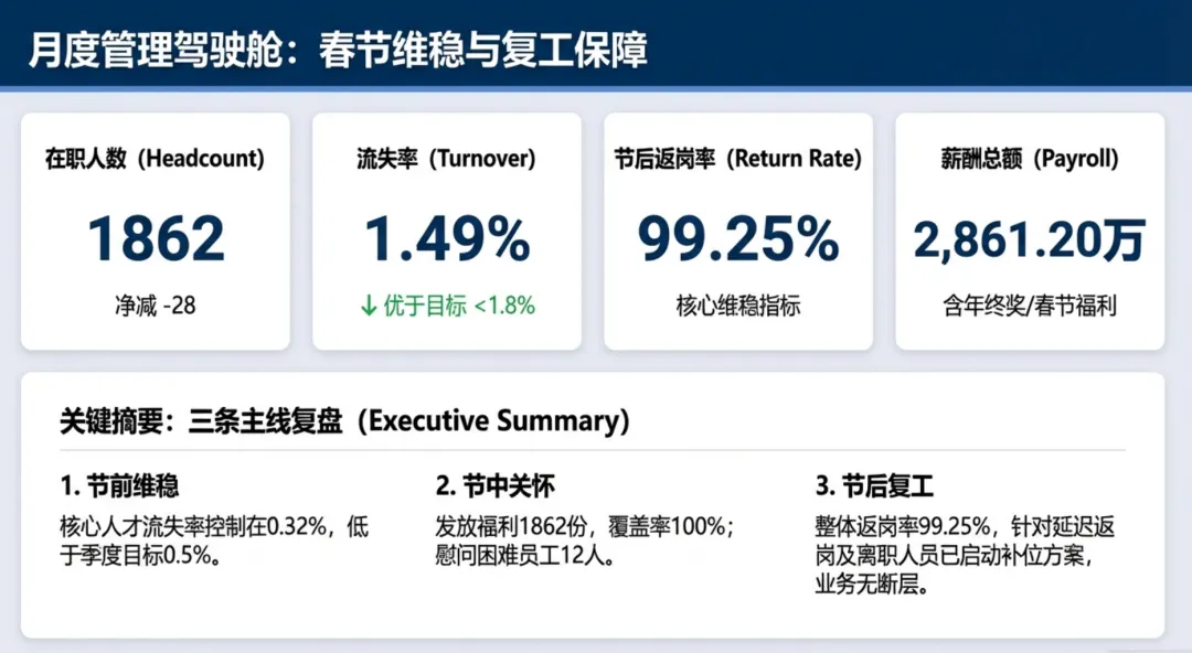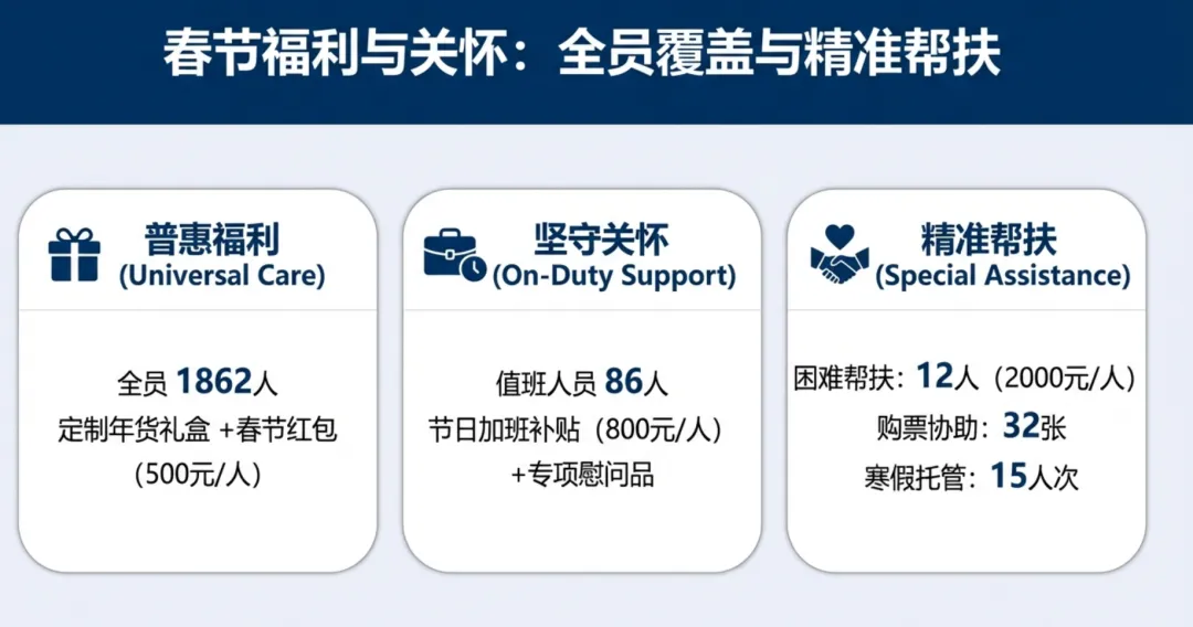 完成节日保障落实到位,足额支付春节福利、加班工资,1862人补岗预算,延迟返岗员工制定灵活补岗方案,业务无断层。