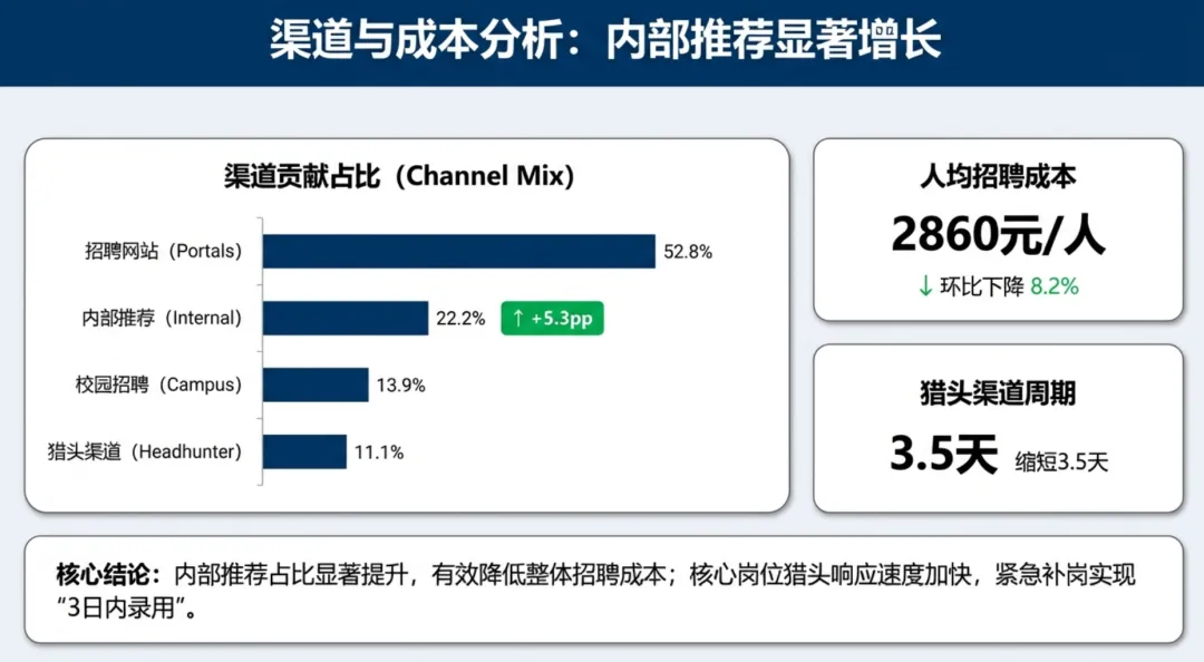 招聘完成持续提升,核心岗位平均招聘周期每周2.3天,内部推荐提升5.3个百分点,人均招聘成本下降8.2%; -