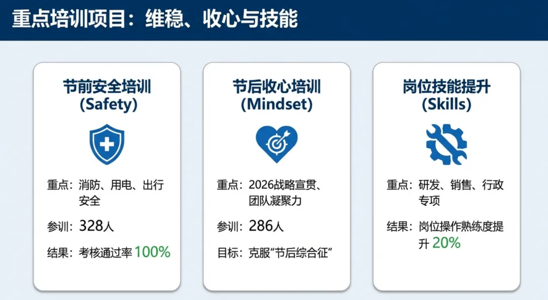 人员维稳成效显着,通过分层面谈、关切节日等举措,核心人才流失率远低于目标,筑牢人才队伍根基; -