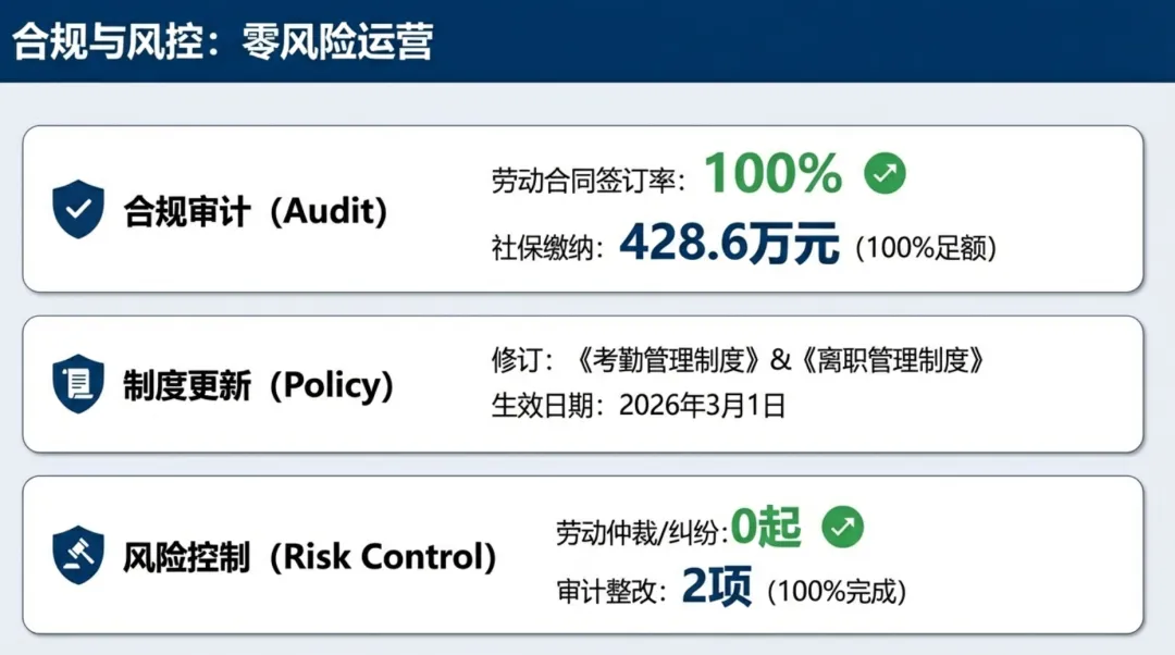 推进数字化建设,调研人力管理工具,启动员工信息、考勤等模块线上化,同时认真落实制度修订和合规检查,确保工合规率100%。