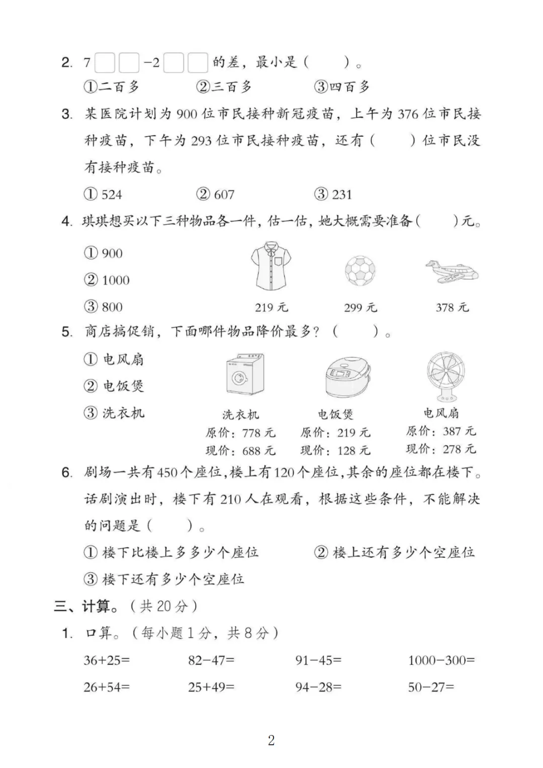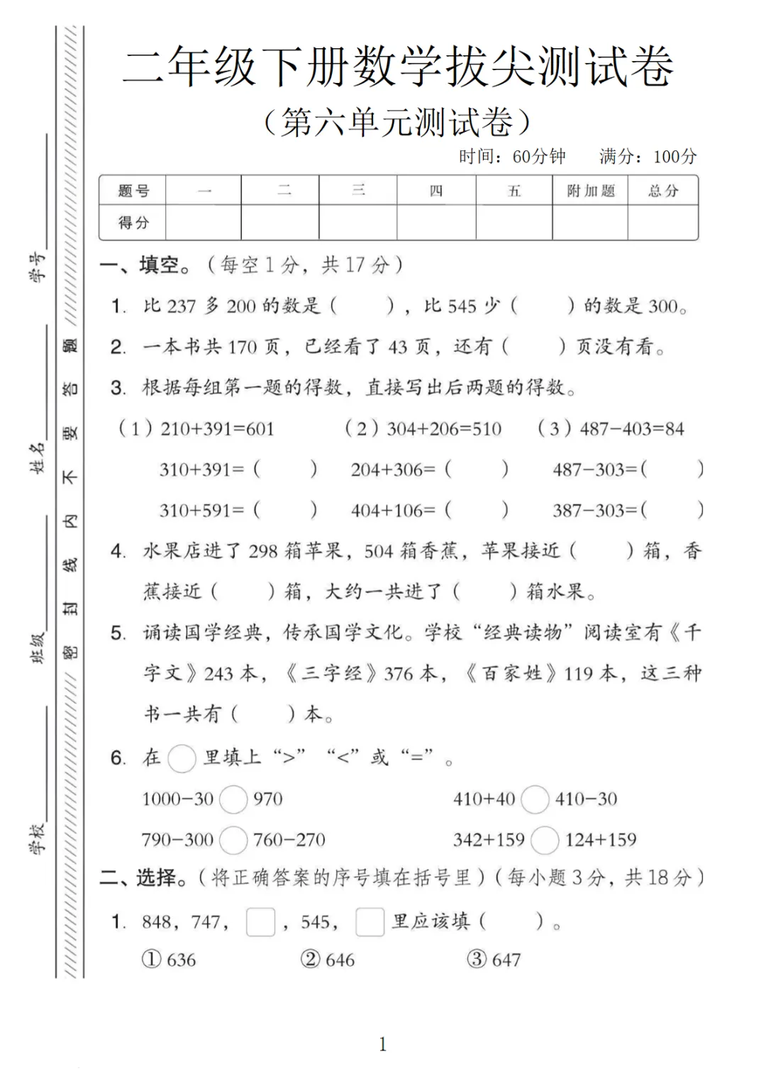 【高清电子版】二年级(下)数学 第六单元拔尖测试卷6《苏教版》