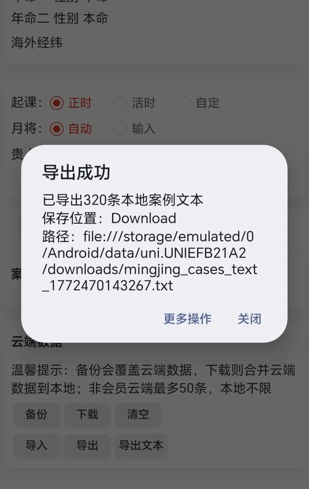 明镜六壬APP推出了案例一键导出到本地文档的功能,只需要不到一秒,所有案例一键导出到本地TXT文件,方便又快捷。你的案例就永远不会丢失了。