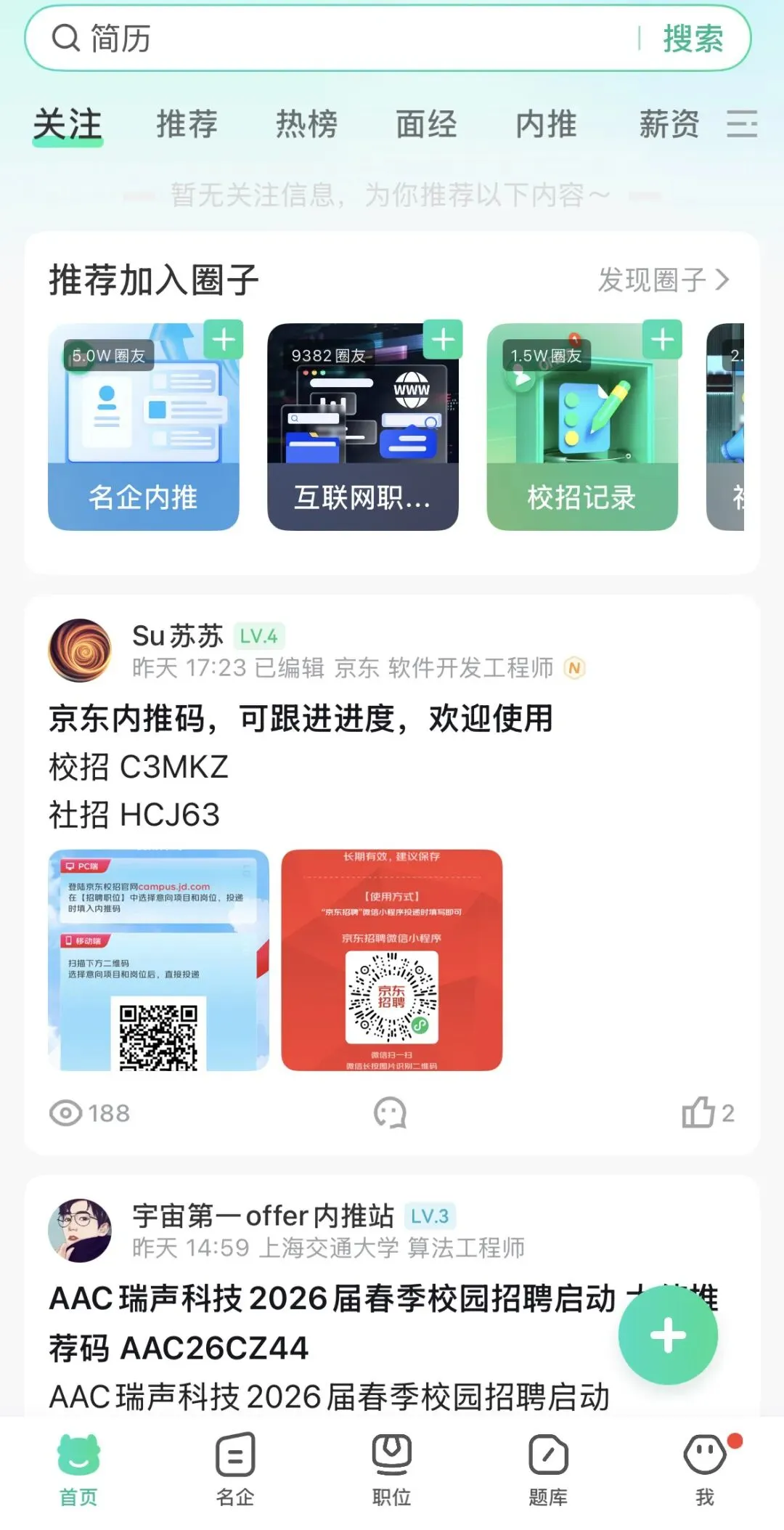 区别于纯工具类产品,这款APP自带活跃的用户社区,定位为技术求职交流场。内容以面经分享、薪资爆料、公司评价、学习笔记、内推互助为主,用户以985/211与双一流高校学生、互联网从业者为主,信息质量相对可控。社区支持提问、讨论、收藏与转发,热门话题实时更新,校招季、秋招春招期间高频同步企业动态与招聘进度。用户可找到同岗位备考伙伴,交流资料与心得,缓解独自备考的信息差与焦虑感,形成学习—求职—交流的正向循环。