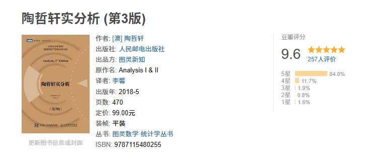豆瓣 9.5 分的封神口碑中,78.9% 读者给出五星好评,MIT、剑桥等名校均将其列为参考书。它兼顾严格性与直观性,用通俗语言拆解抽象概念,从极限、连续性到勒贝格积分,既适合初学者入门,也能满足进阶者深挖本质的需求。陶哲轩更在书中融入思维训练,手把手教你写证明,培养严谨的数学逻辑。