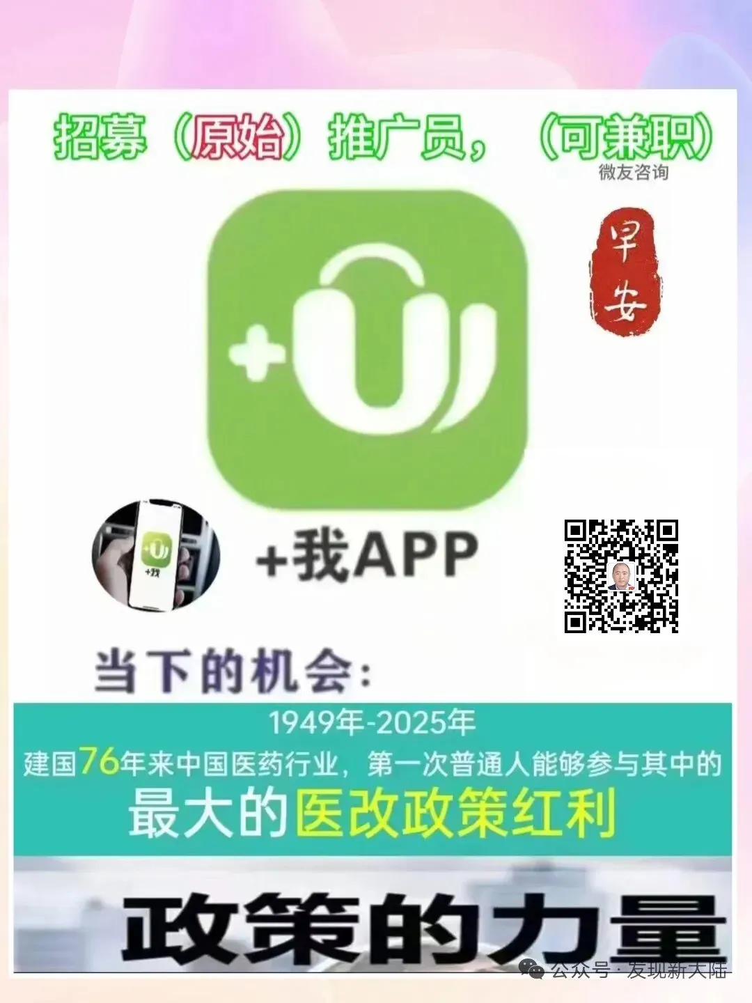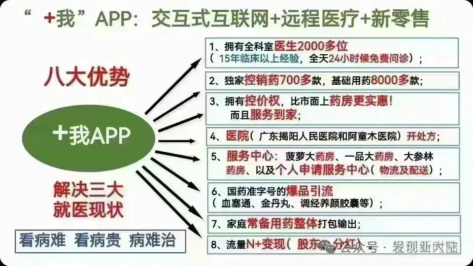 【+我app】:打造中国首款《互网联医疗+医yao》交互式医疗大数据平台,相当于“医疗版”的美团,我们是利用别人的医院、💊房、诊所、医美、中医馆、康养、按摩院、养生馆、美容院等赚钱,打破了原来产品思维,它是互联网思维。以前一个普通老百姓是没办法接触💊品的,今天通过医改政策,我们老百姓也有机会能参与到做医药板块的分润,了解不需要成本,错过的成本却很大。