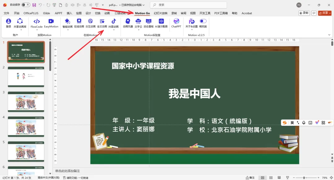 安装完成之后打开,打开转换完成的PPTX文件,上方工具栏出现Motion Go插件,登录之后点击【全文动画】。