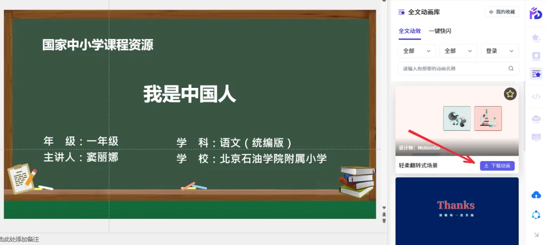 以“轻柔翻转式场景”为例,点击下载动画,动画就会自动下载并应用到全文。