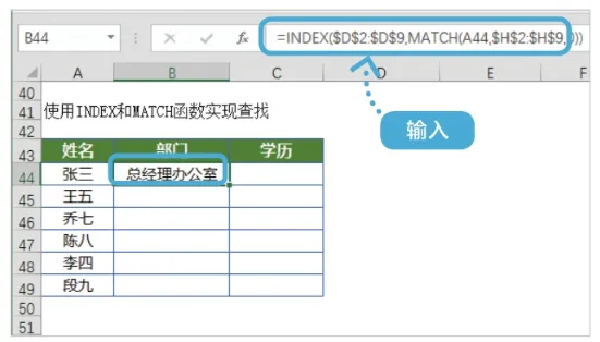 输入“=INDEX($D$2:$D$9,MATCH(A44,$H$2:$H$9,0))”,按【Enter】键即可在B44单元格中显示查找结果“总经理办公室”。
