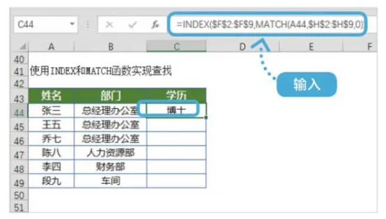 “=INDEX($F$2:$F$9,MATCH(A44,$H$2:$H$9,0))”,按【Enter】键即可在C44单元格中显示查找学历结果“博士”。