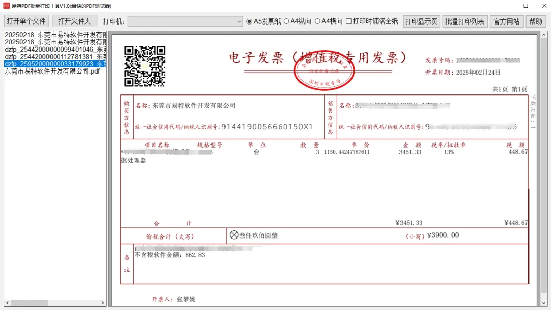 易特PDF电子发票批量打印工具,1秒免费搞定百张发票