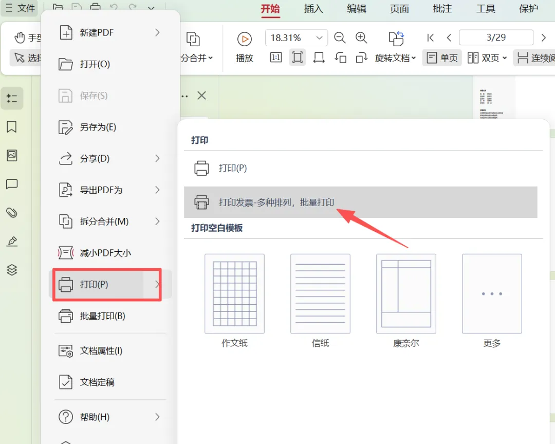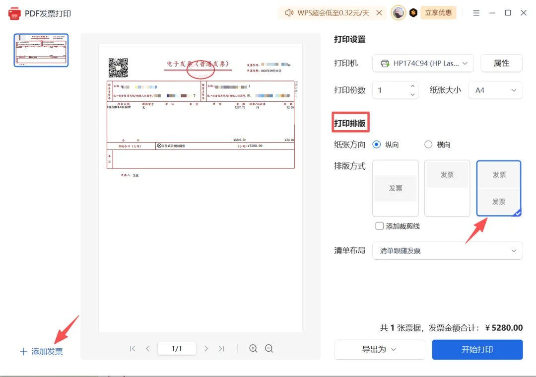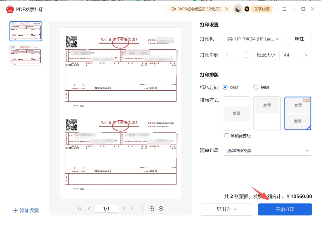 【wps】如何将两张发票打印在一页A4纸上? 点击蓝字 关注我们 解决步骤: 1、点击左上角【文件】-【打印】-【打印发票-多种排列,批量打印】。 2、在“PDF发票打印”对话框中,“打印排版”选择第三种排版类型,点击左下角的【添加发票】。 3、在文件夹中进行,选择需要打印的发票文件,点击【打开】。 4、点击【开始打印】。 📢 如果这篇内容帮到了你,欢迎点赞、转发、推荐支持我! 点赞 收藏 分享