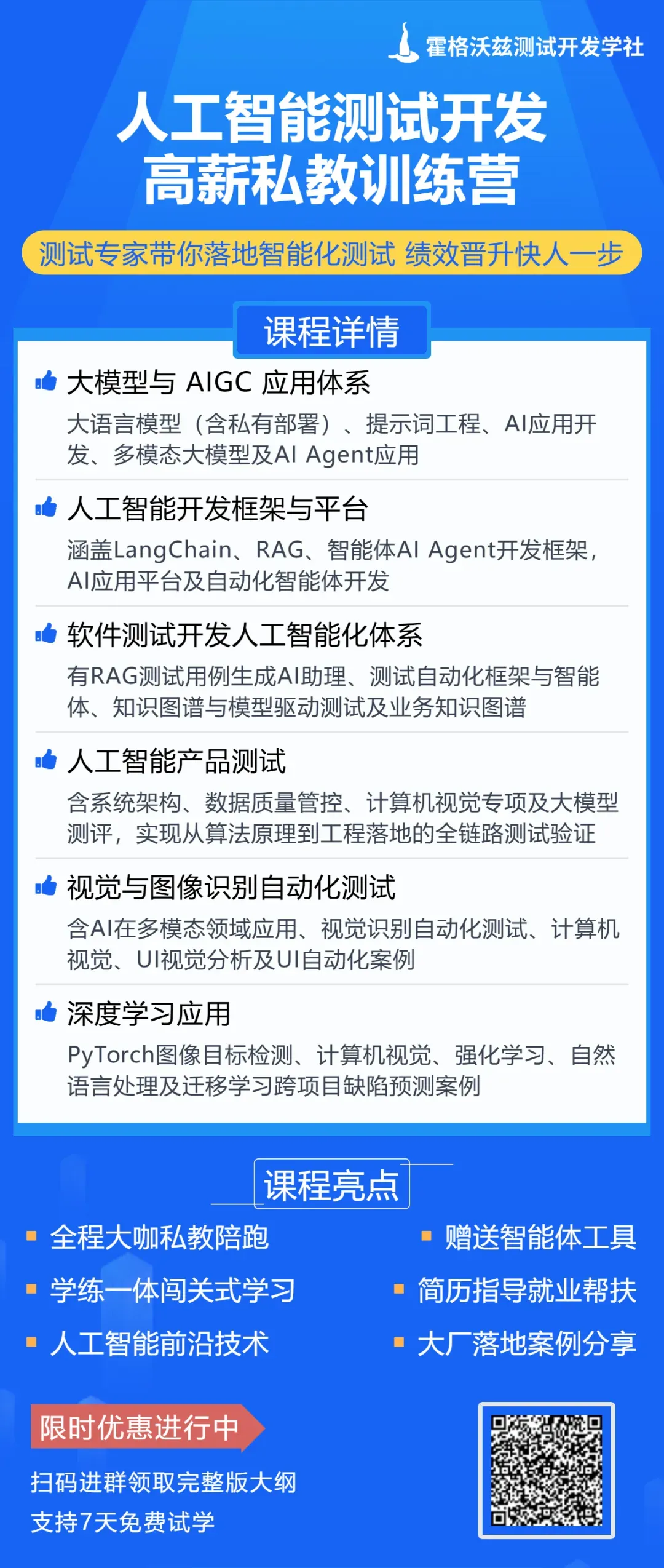 学社围绕现代软件测试工程体系展开,内容涵盖软件测试入门、自动化测试、性能测试、接口测试、测试开发、全栈测试,以及人工智能测试与 AI 在测试工程中的应用实践。