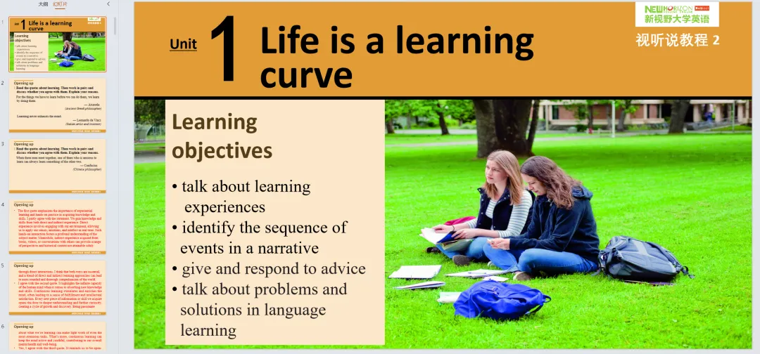 【1】Unit 1 学习之旅(Life is a learning curve):主要内容包含学习经历与成长、听力技巧(关键词捕捉与信号词识别)、口语实践(学习经验分享与目标设定)、核心词汇与句型、视频理解及简短口语汇报。【2】Unit 2 未知之旅(Journey into the unknown):主要内容包含旅行探索与文化体验、听力技巧(预测与信息归纳)、口语实践(旅行计划介绍与游记分享)、核心词汇与短语、视频分析及情景对话演练。【3】Unit 3 休闲时光(Time out):主要内容包含休闲活动与生活平衡、听力技巧(长对话理解与细节定位)、口语实践(兴趣爱好讨论与推荐)、核心词汇运用、视频欣赏及小组展示。【4】Unit 4 城市脉搏(Urban pulse):主要内容包含城市生活与发展、听力技巧(数字记录与信息提取)、口语实践(城市推荐与投诉回应)、核心词汇与句型、视频理解及情景模拟。【5】Unit 5 职业探索(Exploring your career):主要内容包含职业规划与求职准备、听力技巧(职场对话与信息筛选)、口语实践(自我推荐与职业目标讨论)、核心词汇与短语、视频分析及口语报告。【6】Unit 6 科技奇迹(Miracles of technology):主要内容包含科技发展与生活变革、听力技巧(访谈理解与观点提取)、口语实践(科技利弊辩论与展望)、核心词汇运用、视频理解及综合口语展示。