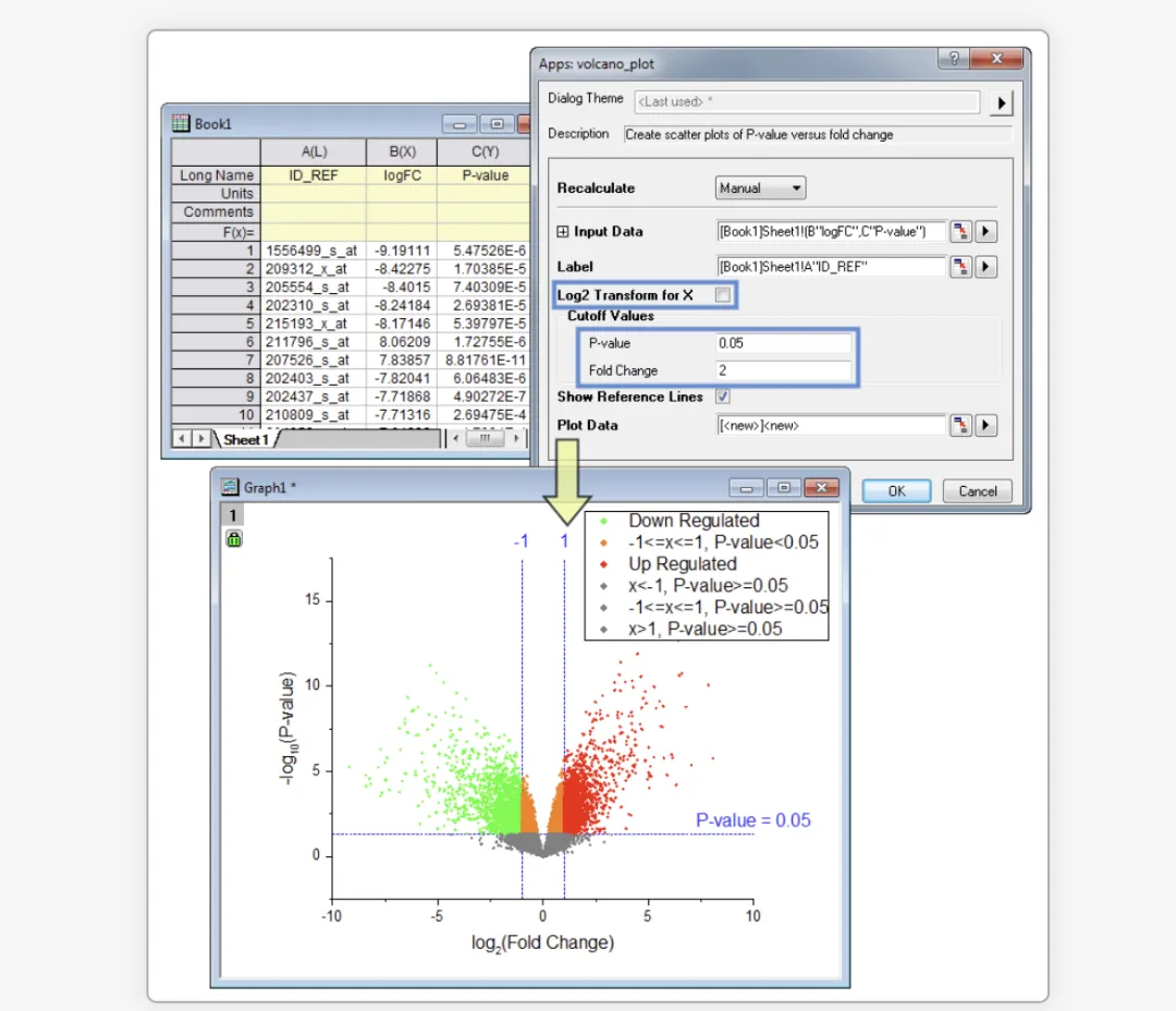 作为 Origin 专属火山图绘制工具,这款插件完美解决传统绘图的 3 大痛点,堪称 “科研数据可视化神器”:✅ 操作极简:无需编程,纯图形化界面,选中数据一键生成,告别繁琐公式计算;✅ 自动换算:支持 X 轴线性数据一键 Log2 转换,不用手动处理 Fold Change 数据;✅ 智能分区:自定义 P 值(0-1)和 Fold Change(>1)阈值,自动用不同颜色标注 “显著上调、显著下调、无差异” 三大区域;✅ 细节可控:可添加参考线、自定义标签,生成的图表直接满足论文投稿格式要求;✅ 兼容性强:适配 Origin 2016SR1 及以上版本,支持各类组学数据、差异表达分析结果等 XY 型数据集。