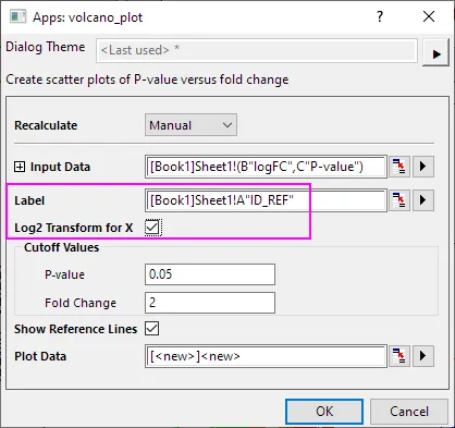X 轴转换:因 X 数据为线性,勾选 Log2 Transform for X,自动将数据转换为 Log2 尺度(符合火山图标准格式); -