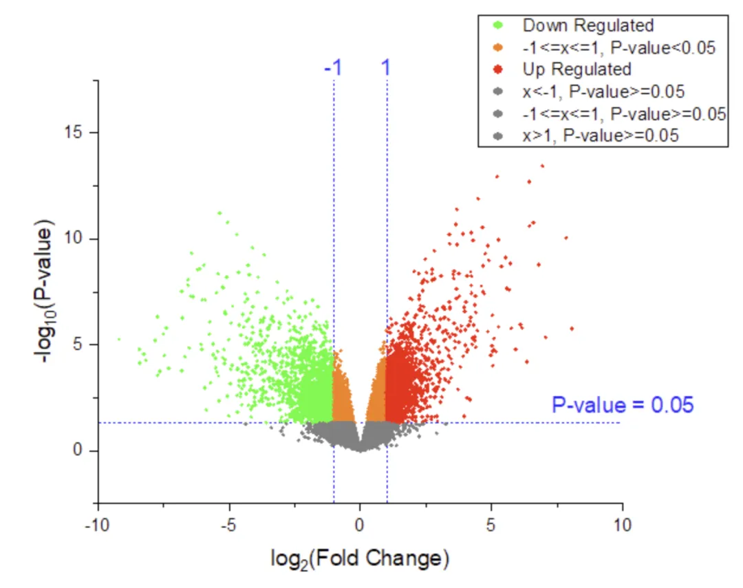 但 Origin 的Volcano Plot 插件直接把复杂流程简化成 “点一点” 操作 —— 无需手动换算、自动分区上色、支持标签自定义,10 分钟就能搞定符合期刊要求的高质量火山图,科研绘图效率直接拉满!