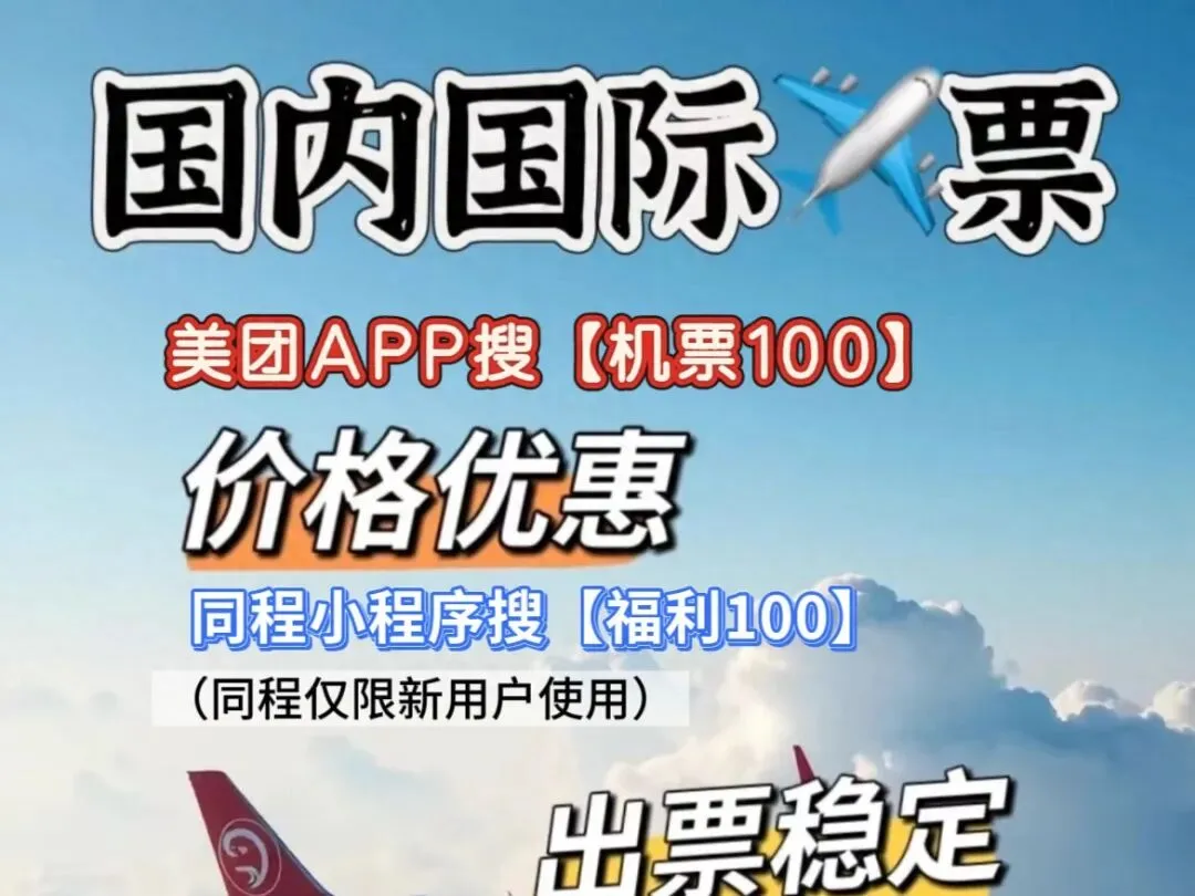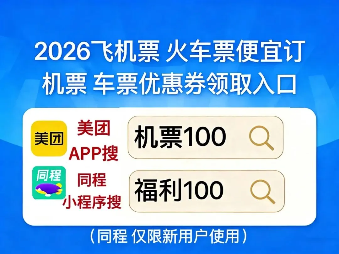 美团APP搜【机票100】同程搜【福利100】低价订机票攻略。2026机票高铁购票攻略:哪个APP订机票便宜?出行机票怎么订便宜?特价机票怎么订?直接去美团APP搜【机票100】同程搜【福利100】领特惠券包,便宜订机票车票啦!