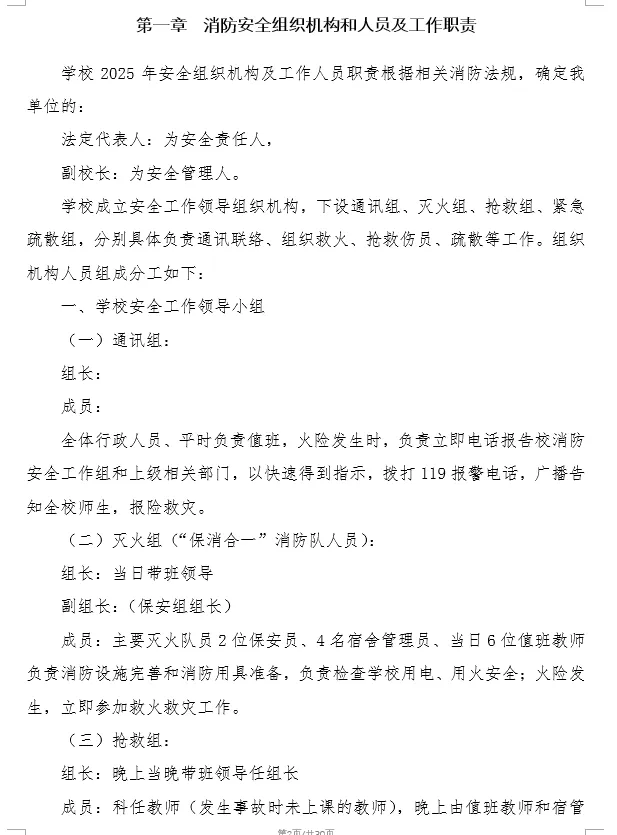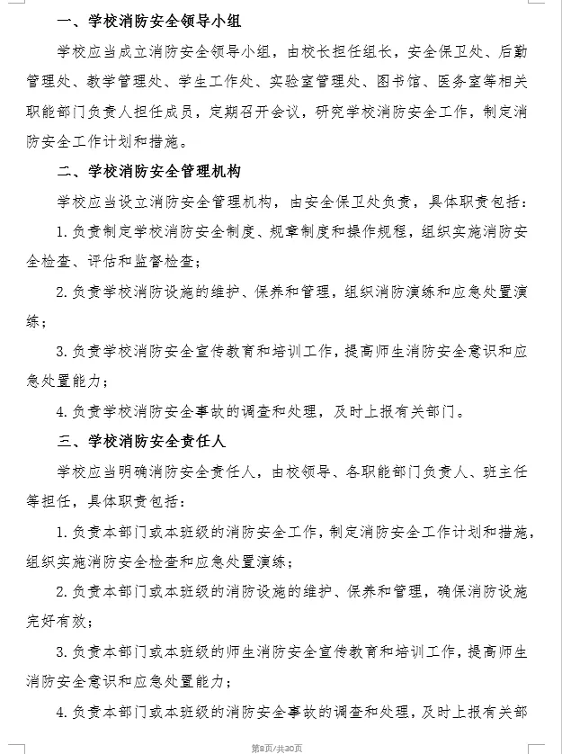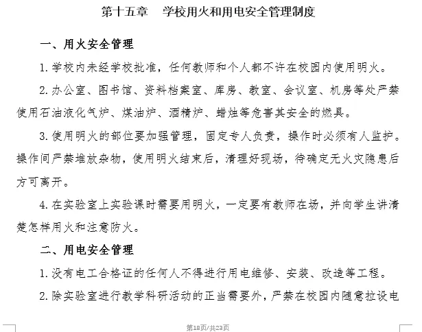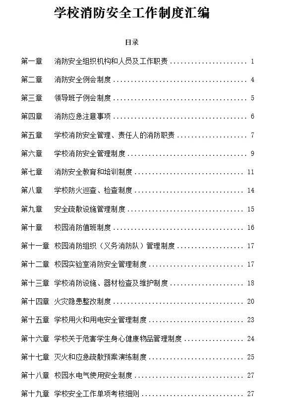 《2025学校消防安全制度汇编》一共19章,涵盖了学校消防工作的方方面面。从组织架构、人员职责,到日常管理、检查巡查,再到教育培训、应急演练,最后还有班主任的考核细则。可以说,学校消防安全怎么做、谁来做、做不到怎么办,全都写清楚了。