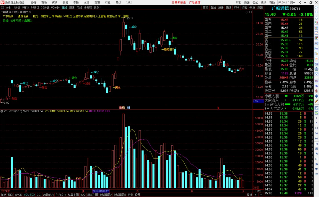 DRAWTEXT(VAR15,HIGH*1.02,’←减仓’),COLORCYAN;