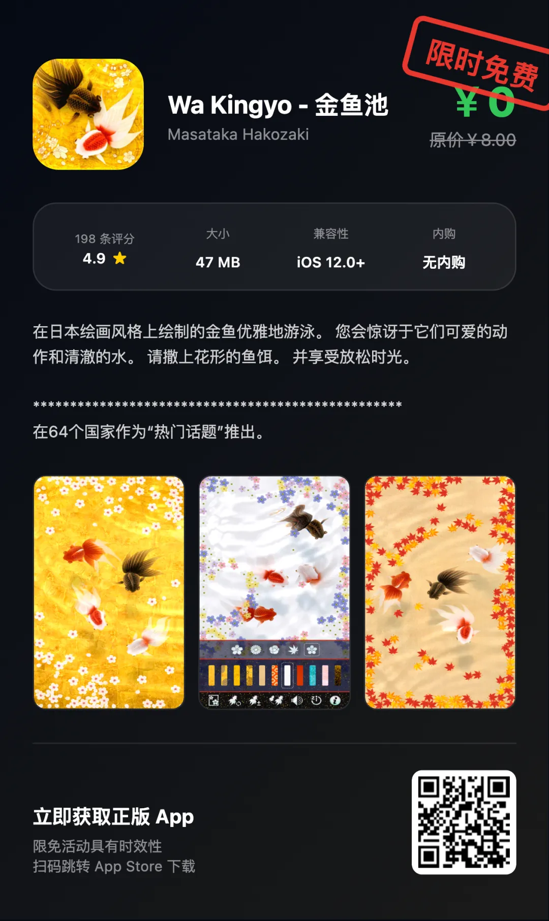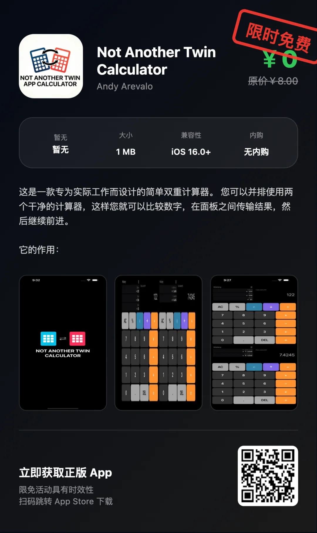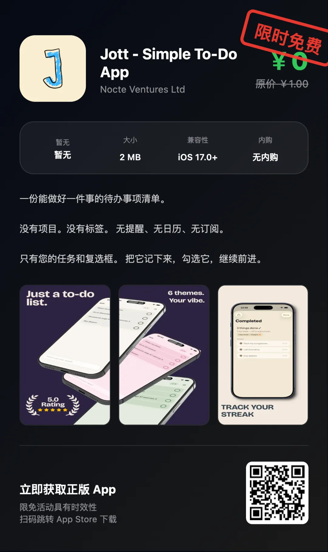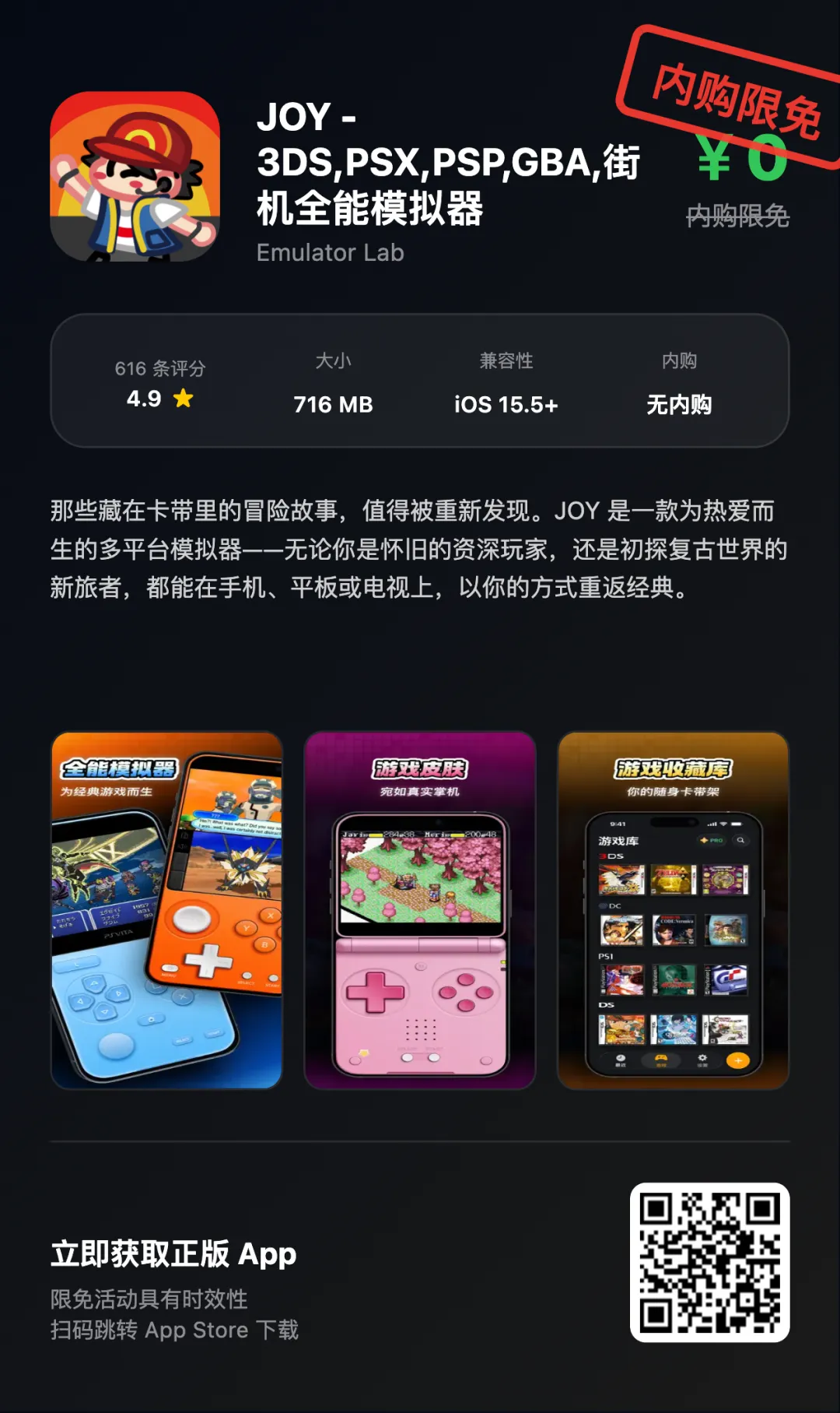 “App Store限免优惠或推荐精品应用,一旦下载,账号再次下载即永久免费!如果收费则为限免结束!!下载前请仔细核对应用或游戏价格,实际价格以App Store页面为准”