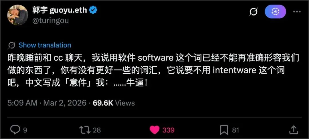 这个词的诞生本身就带着意件时代的烙印。前两天,郭宇(@turingou)在睡前和 AI 聊天时随口感慨:用软件 software 这个词已经不能再准确形容我们做的东西了,你有没有更好的词汇?AI 沉吟片刻,回答:Intentware,中文写成”意件“。