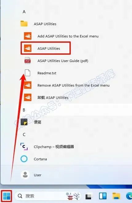 温馨提示:若打开Excel表格没有ASAP Utilities工具箱,请到开始菜单点击ASAP Utilities