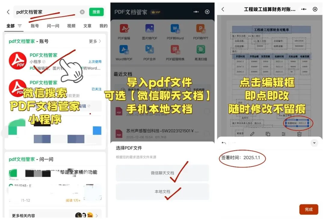 我指了指手机:“靠PDF文档管家啊。微信里直接搜,导入、编辑、改字、加注释,几分钟就搞定。现在不管在哪,只要手机有电,紧急改PDF都不慌。”