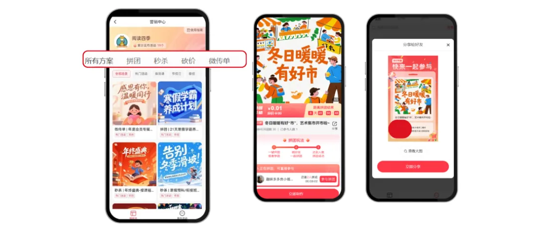 拼团、打卡营、体验课等营销活动模板直接套用,配套海报、文案、操作手册,不用再从零设计,轻松打造 “专属招生活动”。 -